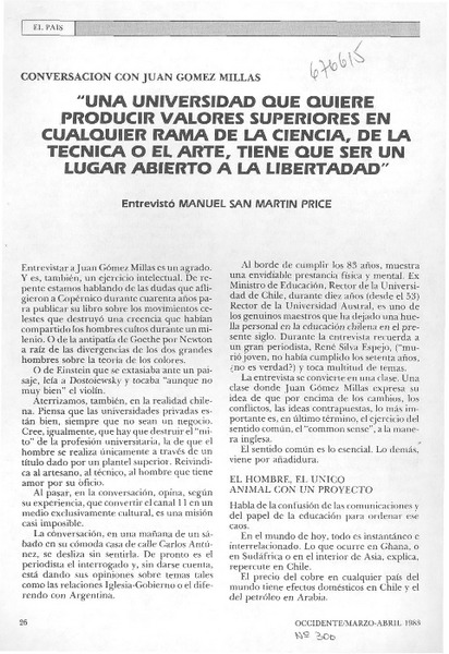 Una universidad que quiere producir valores superiores en cualquier rama de la ciencia, de la técnica o el arte, tiene que ser un lugar abierto a la libertad" : [entrevista] [artículo] Manuel San Martín Price.
