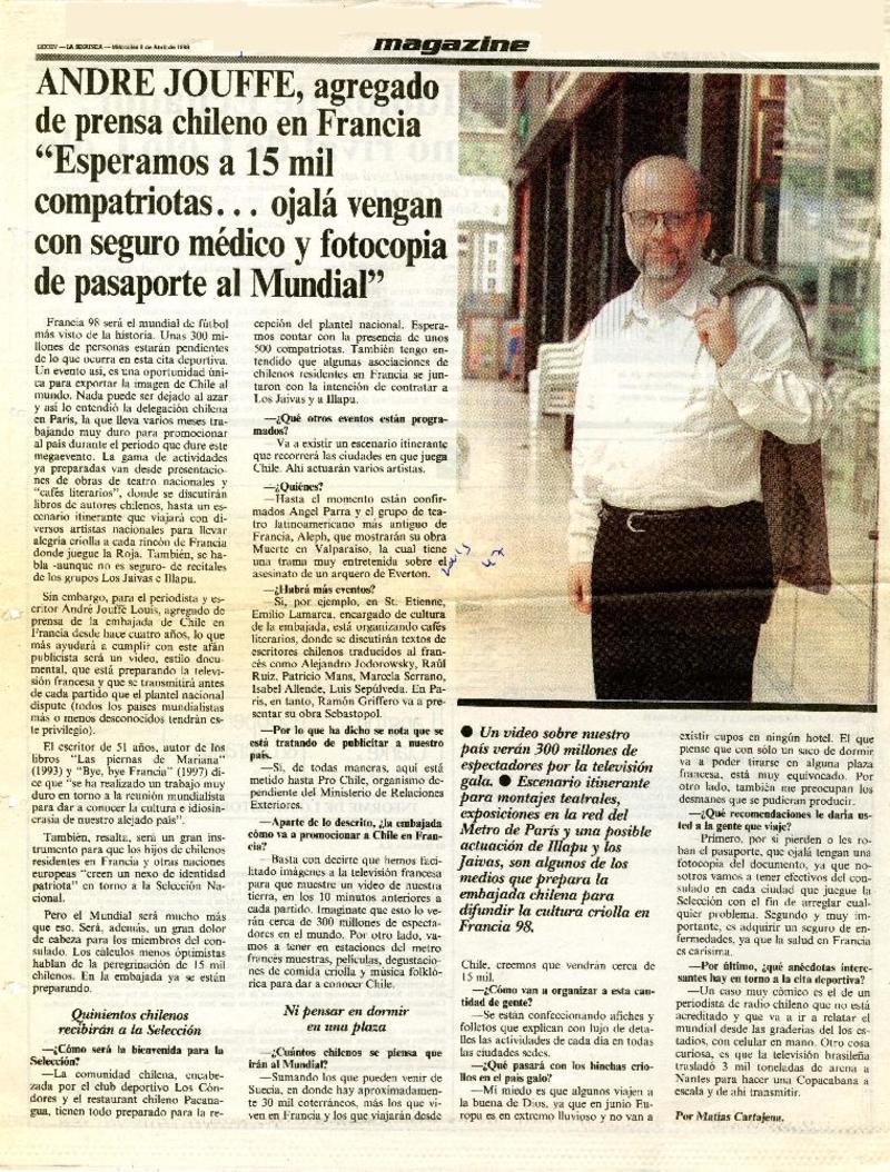 André Jouffé, agregado de prensa chileno en Francia "Esperamos a 15 mil compatriotas -- ojalá vengan con seguro médico y fotocopia de pasaporte al Mundial" [artículo] Matías Cartajena.