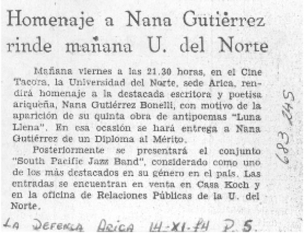 Homenaje a Nana Gutiérrez rinde mañana U. del Norte. [artículo]