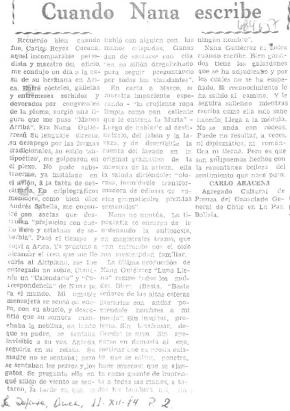 Cuando Nana escribe [artículo] Carlo Aracena.