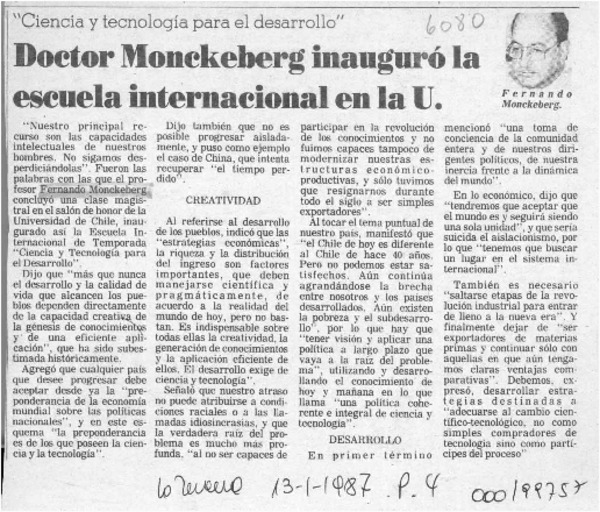 Doctor Monckeberg inauguró la escuela internacional en la U [artículo].