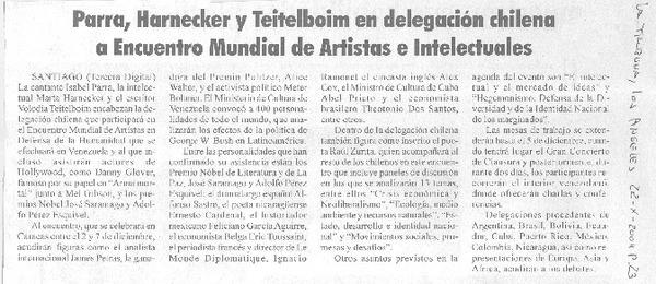 Parra, Harnecker y Teitelboim en delegación chilena a Encuentro Mundial de Artistas e Intelectuales [artículo]