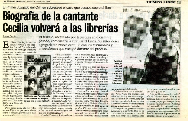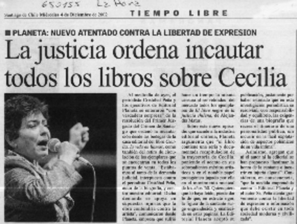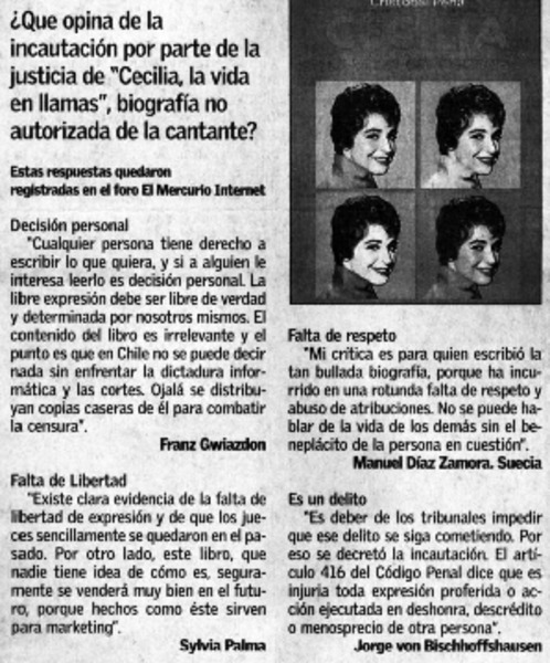 ¿Qué le parece que los tribunales de justicia hayan incautado una nueva publicación, en este caso la biografía de la cantante Cecilia?. [artículo]