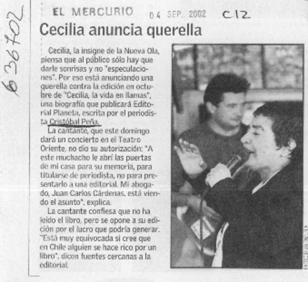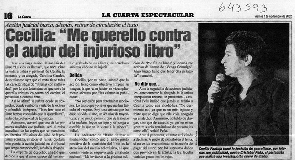 Cecilia: "me querello contra el autor del injurioso libro" [artículo].