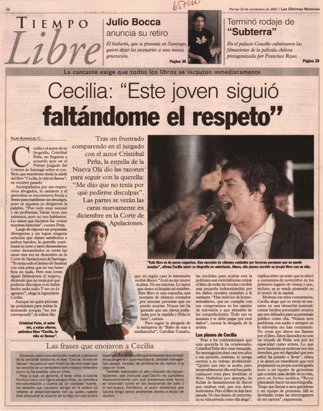 Cecilia, "creo que el escritor se pasa rollos obscenos conmigo" intérprete confiesa que está dolida por la biografía y presentó recurso de protección. [artículo] :