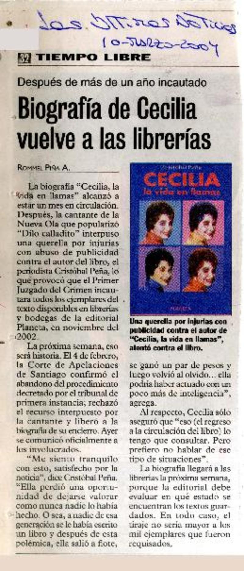 Biografía de Cecilia vuelve a las librerías [artículo] Rommel Piña A.