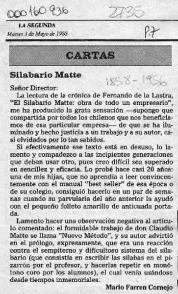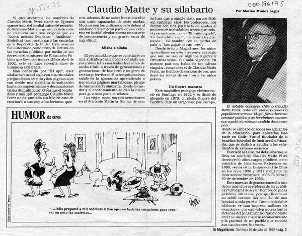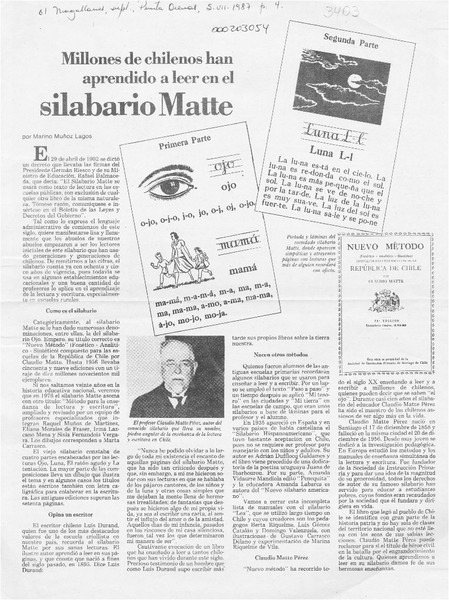 Millones de chilenos han aprendido a leer en el silabario Matte [artículo] Marino Muñoz Lagos.