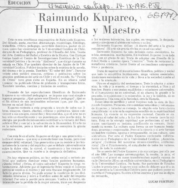 Raimundo Kupareo, humanista y maestro [artículo] Lucas Fertilio.