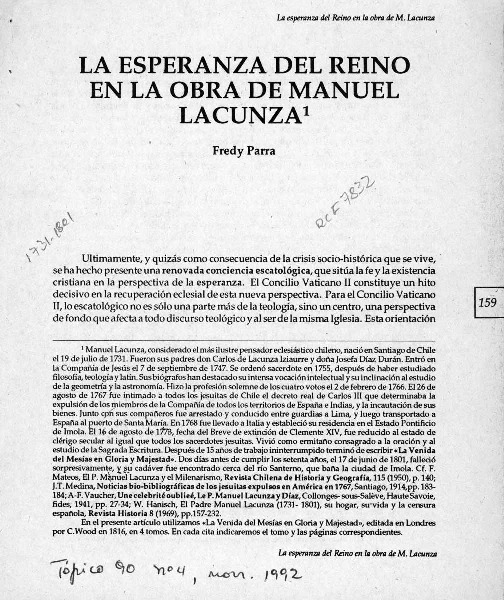 Historia y esperanza en la obra de Manuel Lacunza [artículo] Freddy Parra C.