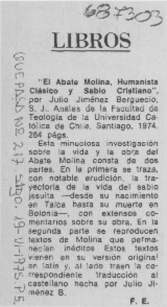 El Abate Molina, humanista clásico y sabio cristiano [artículo] F. E.