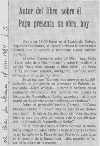 Luis Alberto Cornejo; "En mi libro sobre el Papa traté de describir al hombre" : [entrevista] [artículo] Pacián Martínez.