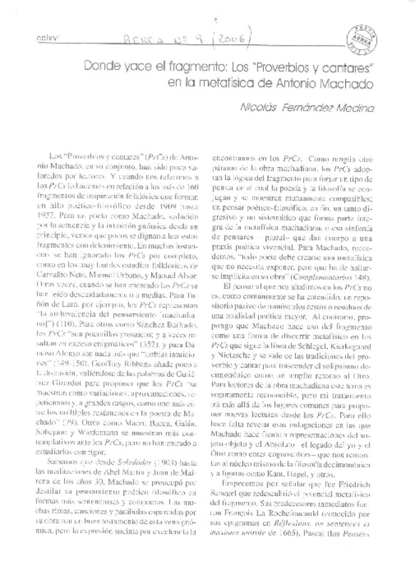 Donde yace el fragmento : "los proverbio sy cantares" en la metafísica [artículo] Nicolás Fernández-Medina.