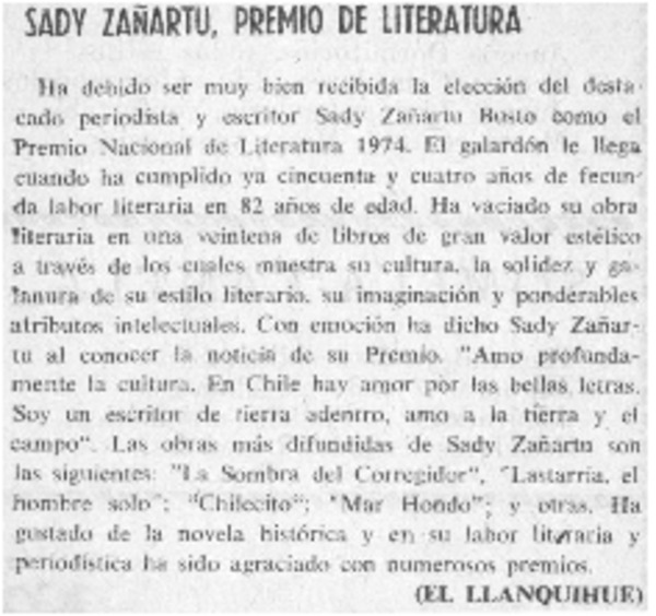 Sady Zañartu, Premio de Literatura [artículo] El Llanquihue.