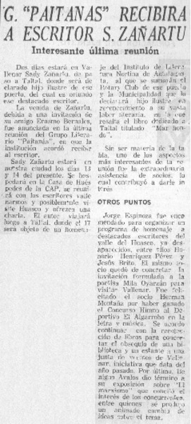 G. "Paitanas" recibirá a escritor S. Zañartu [artículo].