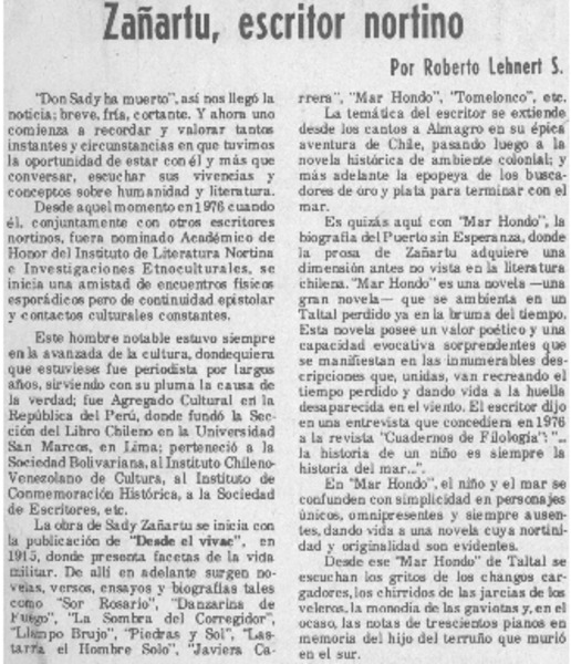 Falleció escritor Sady Zañartu. [artículo]