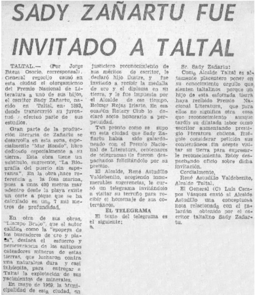 Municipalidad declaró hijo ilustre de Taltal al escritor Sady Zañartu [artículo] Jorge Baeza Osorio.