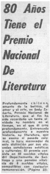 Sady Zañartu, Premio Nacional de Literatura. [artículo]