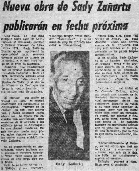 Nueva obra de Sady Zañartu publicarán en fecha próxima. [artículo]