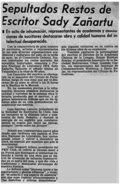 Sepultados restos de escritor Sady Zañartu. [artículo]