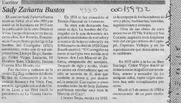 Falleció escritor Sady Zañartu Bustos. [artículo]