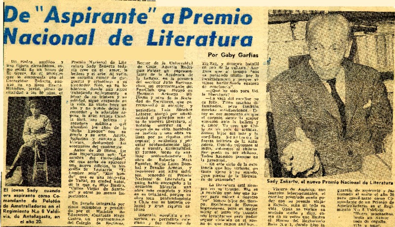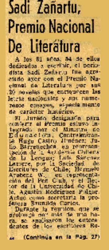 Sadi Zañartu, Premio Nacional de Literatura. [artículo]