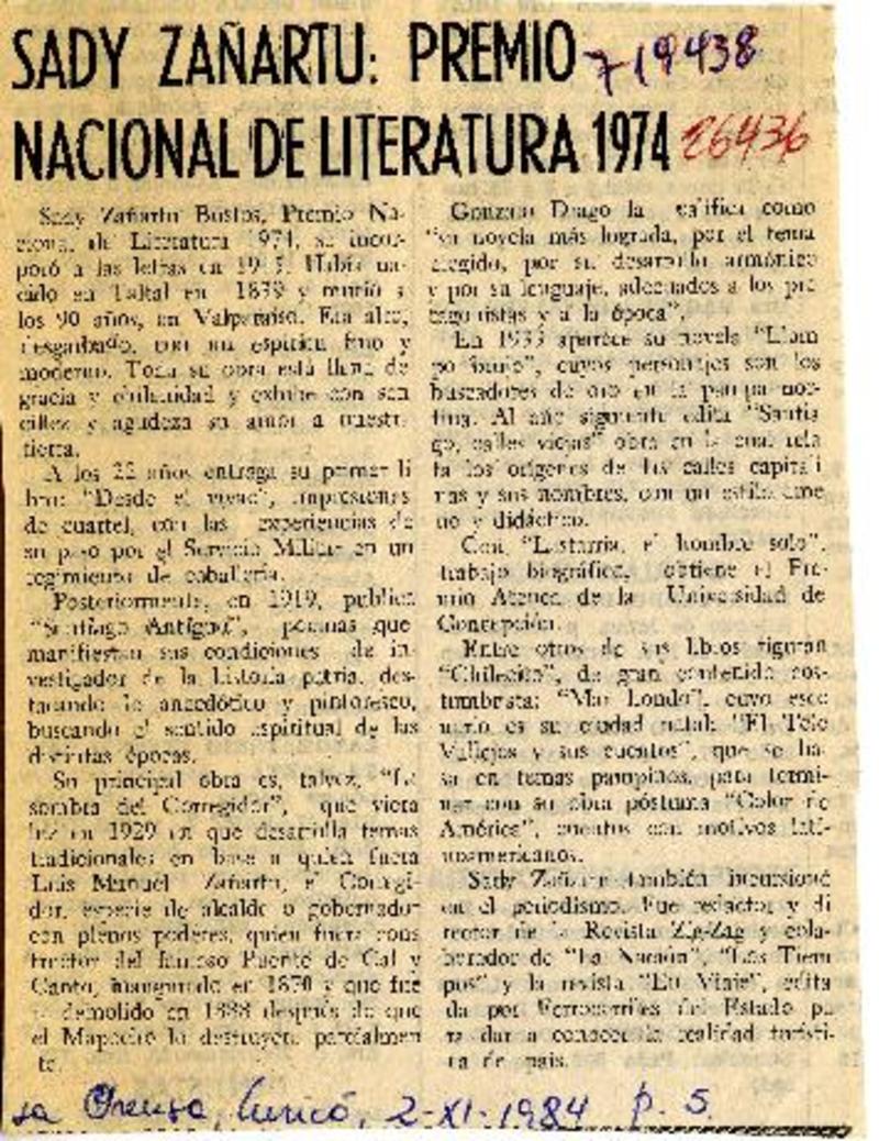 Sady Zañartu: Premio Nacional de Literatura 1974 [artículo]