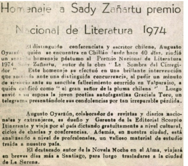 Homenaje a Sady Zañartu premio Nacional de Literatura 1974. [artículo]