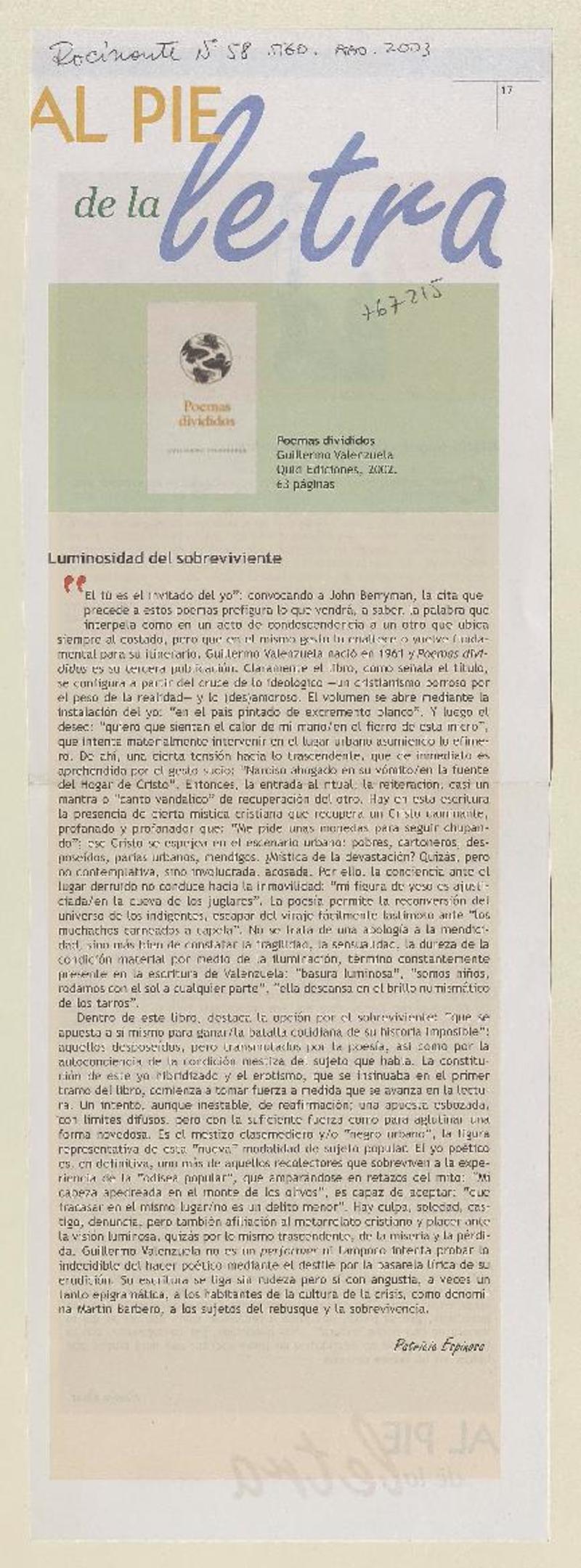 Luminosidad del sobreviviente [artículo] Patricia Espinosa.