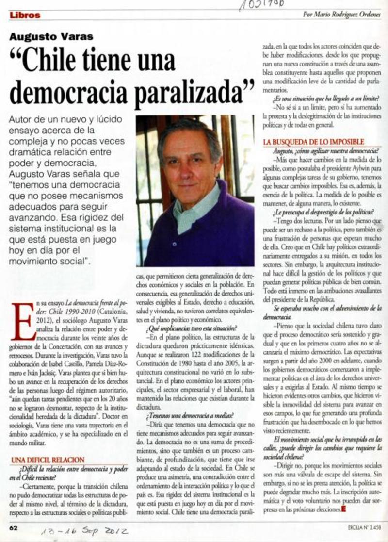Augusto Varas. "Chile tiene una democracia paralizada [artículo] Mario Rodríguez Ordenes.