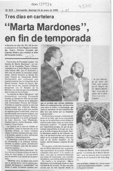 "Exito de "Marta Mardones" está en la vigencia de su personaje central" [artículo].