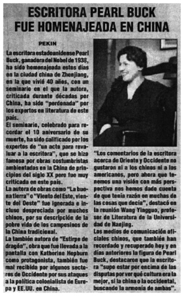 Escritora Pearl Buck fue homenajeada en China. [artículo]