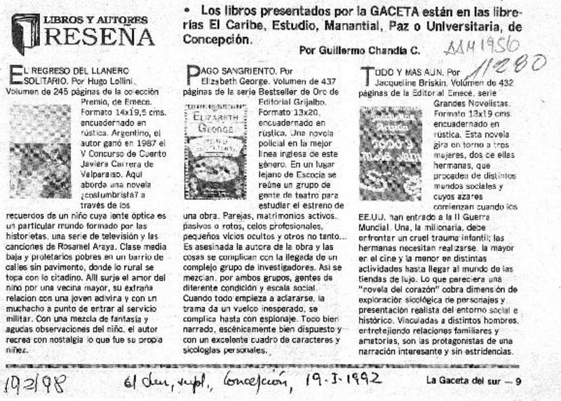 Autores argentinos - Autoras estadounidenses - Briskin, Jaqueline - Todo y más aún - George, Elizabeth - Pago sangriento - Lollini, Hugo - Regreso del llanero solitario