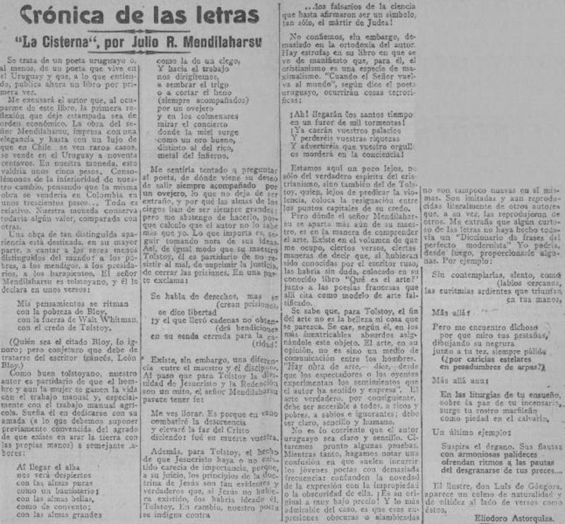 La Cisterna", por Julio R. Mendilaharsu [artículo] Eliodoro Astorquiza.