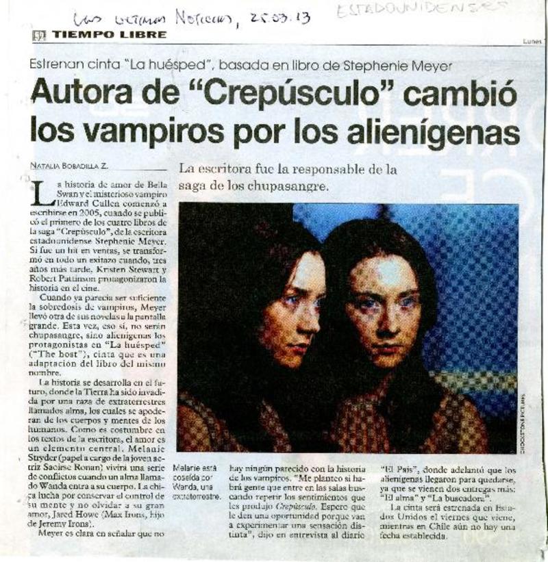 Autora de "Crepúsculo" cambió los vampiros por los alienígenas [artículo] Natalia Bobadilla Z.