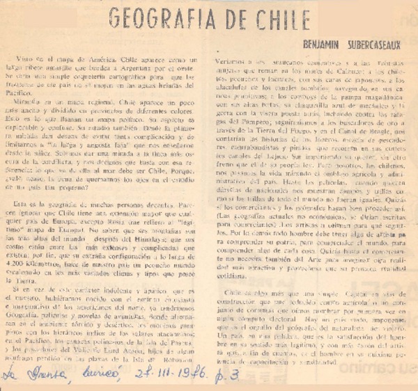 Autores chilenos - Subercaseaux, Benjamín - Geografía de Chile