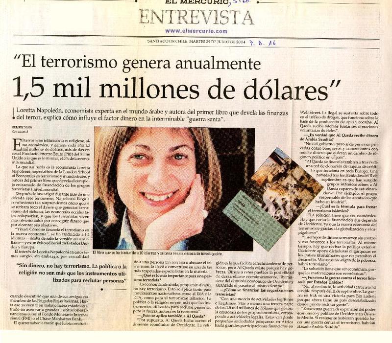 El terrorismo genera anualmente 1,5 mil millones de dólares" [artículo] Beatriz Silva.