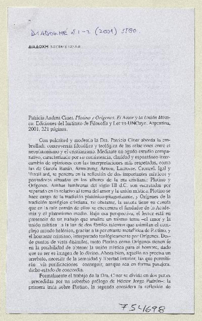 Plotino y orígenes [artículo] Alvaro Pizarro.