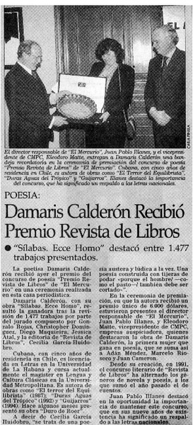 Damaris Calderón recibió premio revista de libros. [artículo]