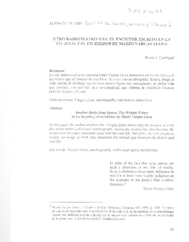 Otro radioteatro más: El escritor escrito en la Tía Julia y el escribidor de Mario Vargas Llosa [artículo] Brent J. Carbajal.