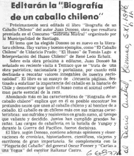 Editarán la "Biografía de un caballo chileno". [artículo]