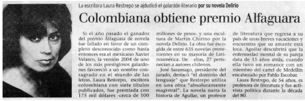 Colombiana Laura Restrepo ganó Premio Alfaguara 2004. [artículo]