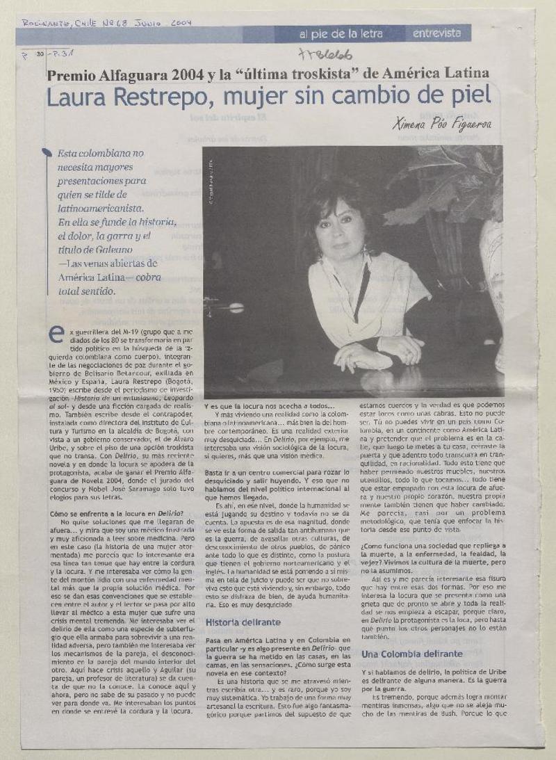 Laura Restrepo, mujer sin cambio de piel [artículo] Ximena Poo.