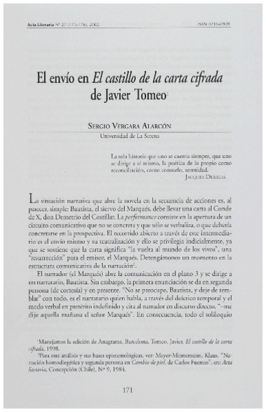 El envío en El castillo de la carta cifrada de Javier Tomeo [artículo] Sergio Vergara Alarcón.
