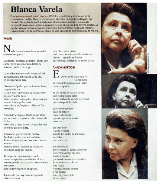 Poesía femenina conquista el Premio Octavio Paz peruana Blanca Varela es la primera mujer que obtiene el galardón [artículo] :