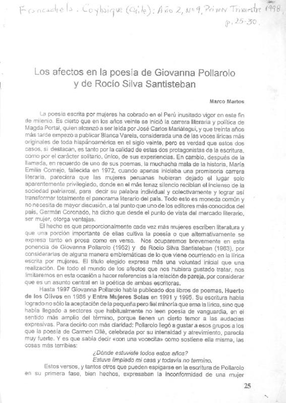 Los afectos en la poesía de Giovanna Pollarolo y de Rocío Silva Santisteban [artículo] Marco Martos.