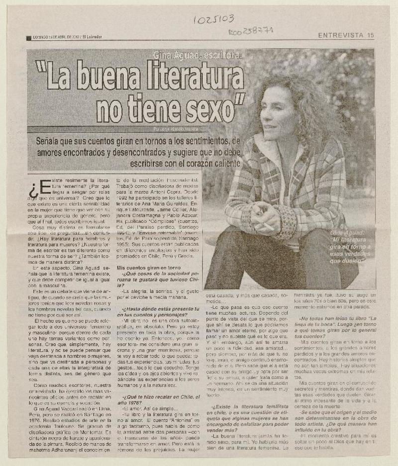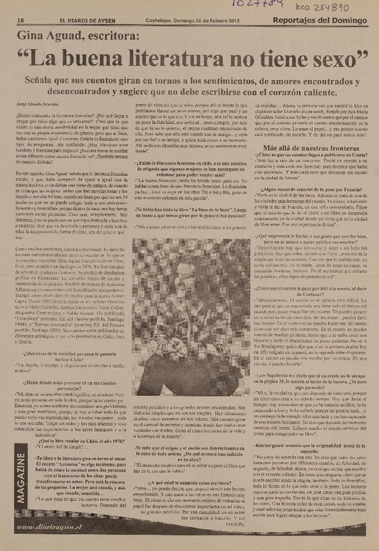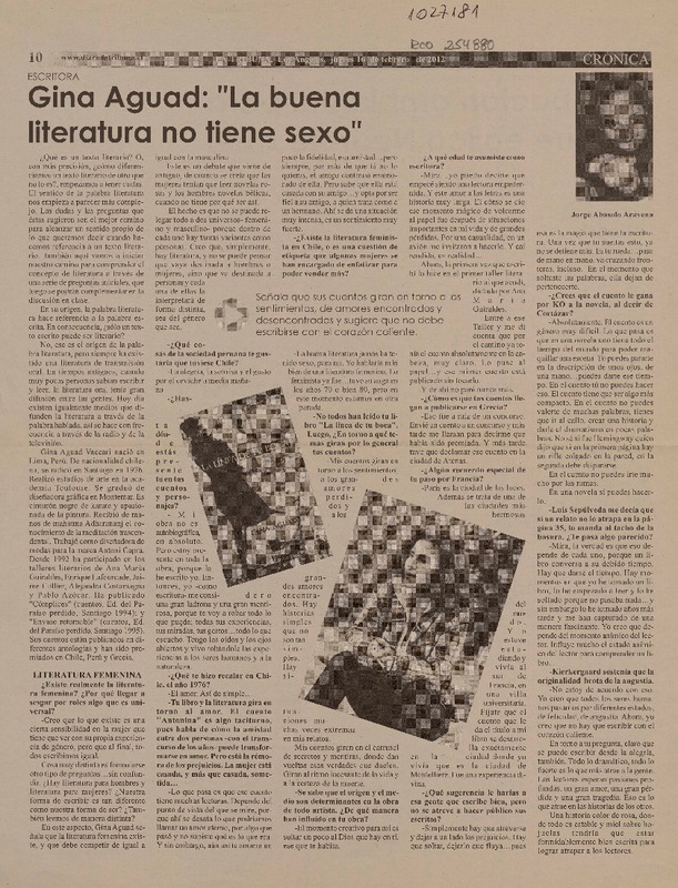 "La buena literatura no tiene sexo" (entrevista) [artículo] Jorge Abasolo Aravena.