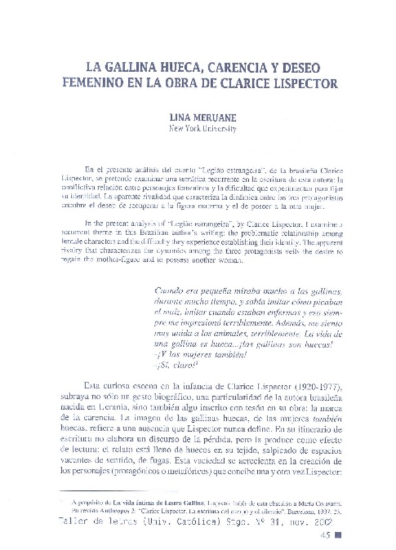 La gallina hueca, carencia y deseo femenino en la obra de Clarice Lispector [artículo] Lina Meruane.
