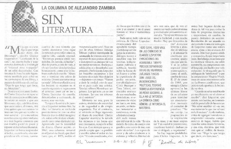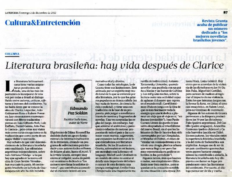 Literatura brasileña: hay vida después de Clarice [artículo] Edmundo Paz Soldán