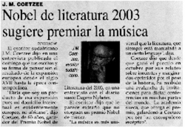 Nobel de literatura 2003 sugiere premiar la música [artículo]