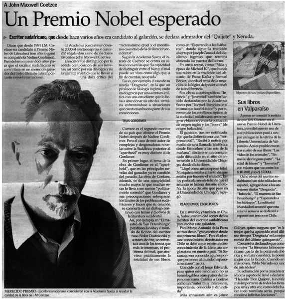 Coetzee ganó Nobel de Literatura. [artículo]